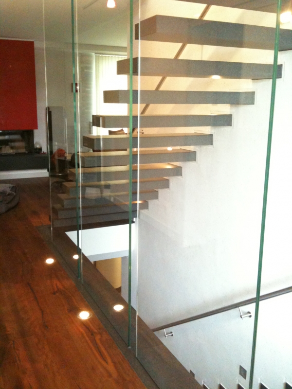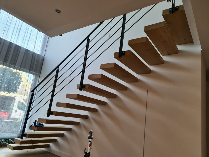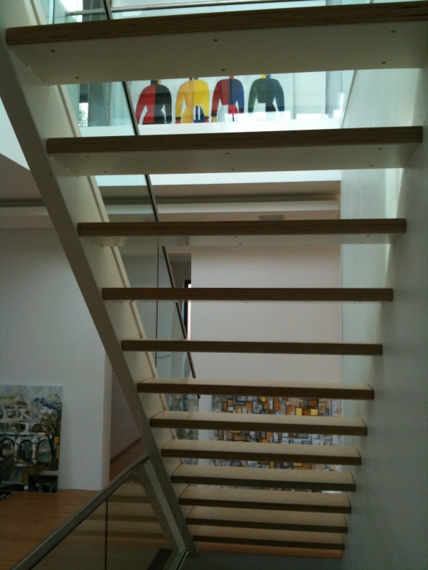 einseitige Treppenwange, Oberfläche lackiert, mit Holzstufen